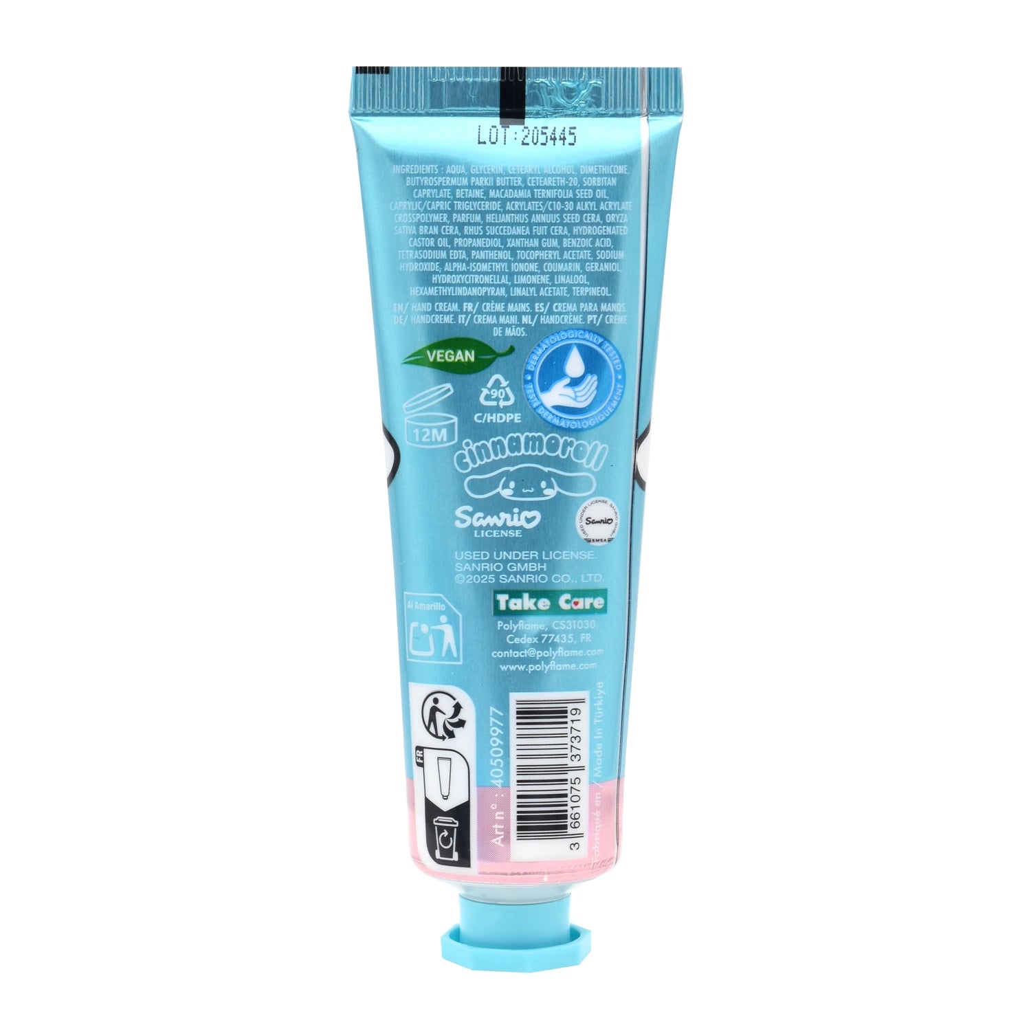 La crème mains Cinnamoroll enveloppe la peau dans un nuage de tendresse tout en la laissant douce, nourrie et délicatement parfumée à la fleur de musc 🌸